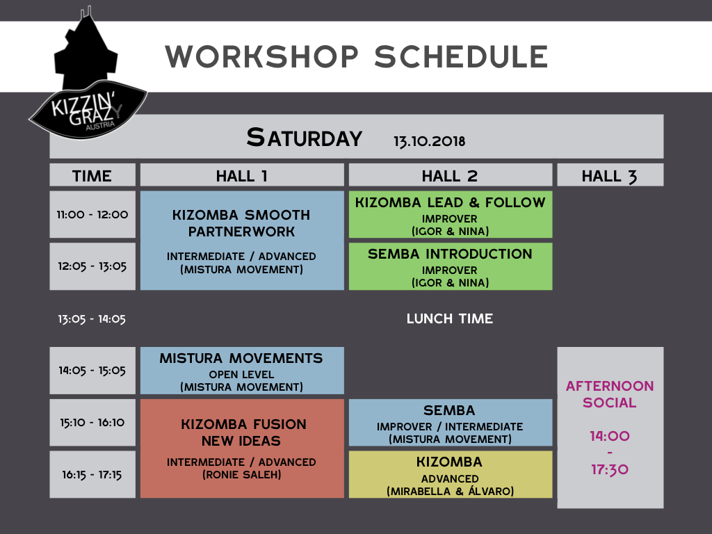 Workshops Die Workshops sind in der Tanzschule Conny & Dado, Körösistraße 81, 8010 Graz Hall 1 = Saal 1 (0)Hall 2 = Saal 4 (-1) Hall 3 = Saal 3 (-1)
