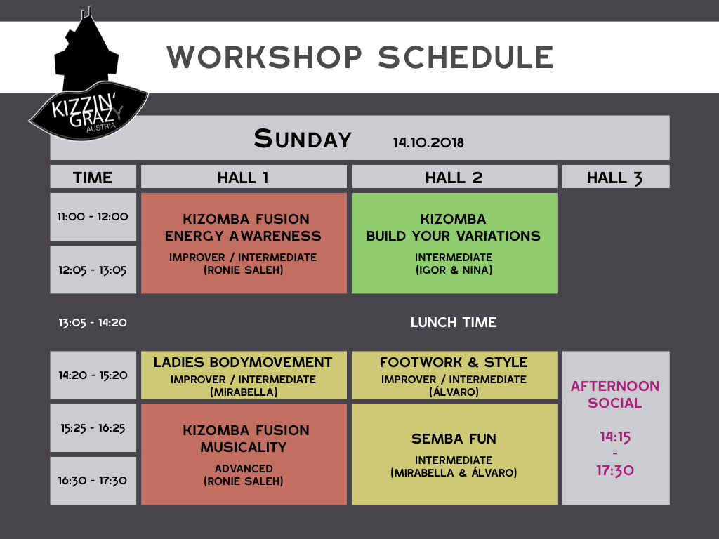 Workshops Die Workshops sind in der Tanzschule Conny & Dado, Körösistraße 81, 8010 Graz Hall 1 = Saal 1 (0)Hall 2 = Saal 4 (-1) Hall 3 = Saal 3 (-1)